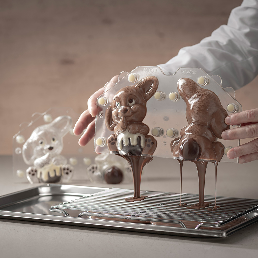 Schokoladen-Giessform Ostern Hase Nino zum Ausgiessen mit Schokolade 2er Form mit Magnetverschluss. Masse Hase: ca 108 x 142 x 83 mm